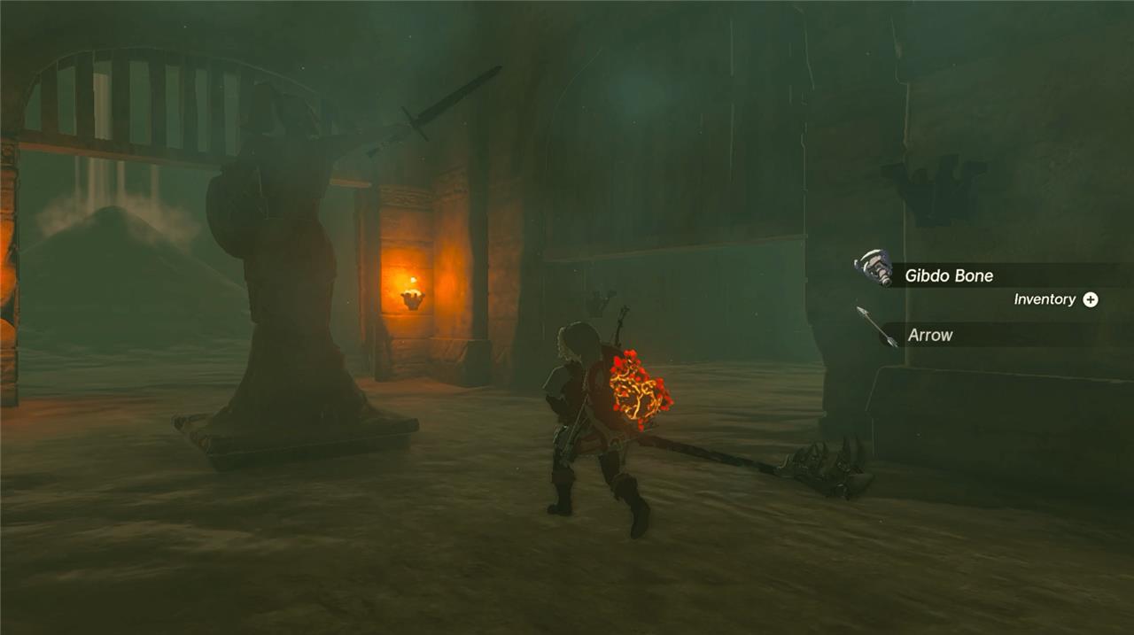 2. Head left, dealing with any Gibdos that you meet on your way. Fire-based attacks, such as a fire fruit attached to an arrow, make short work of these. Follow the corridor ’round to the right and note the statue pointing right with its sword. Take the hint, and turn right under the half-open gate.