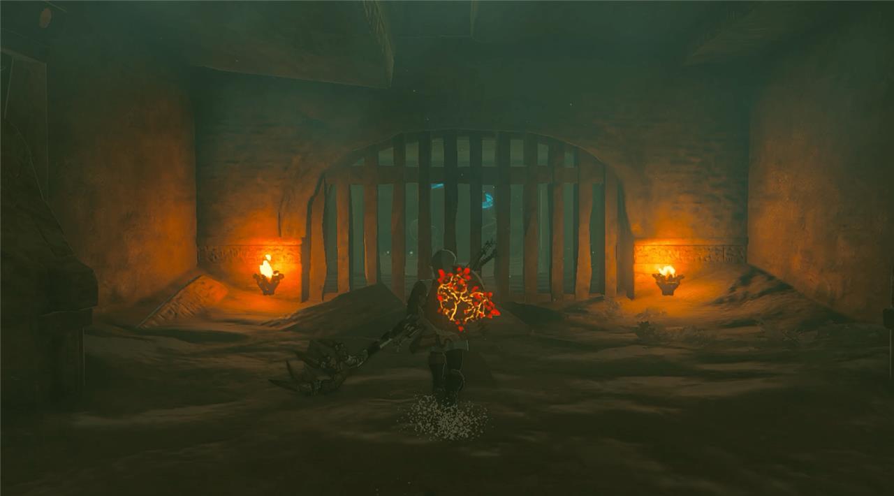 Chichim Shrine is located in the Gerudo Desert, hidden inside a small cave system called the South Gerudo Cave. The entrance can be found near the coordinates (-3211, -3006, -0050), west of Mount Nabooru. You’ll need protection from the desert heat during the day and may need to clear out sand-covered rocks blocking the entrance. Look for a glowing trail or breeze hinting at a concealed opening, and use a bomb or rock hammer to break through before heading inside.
