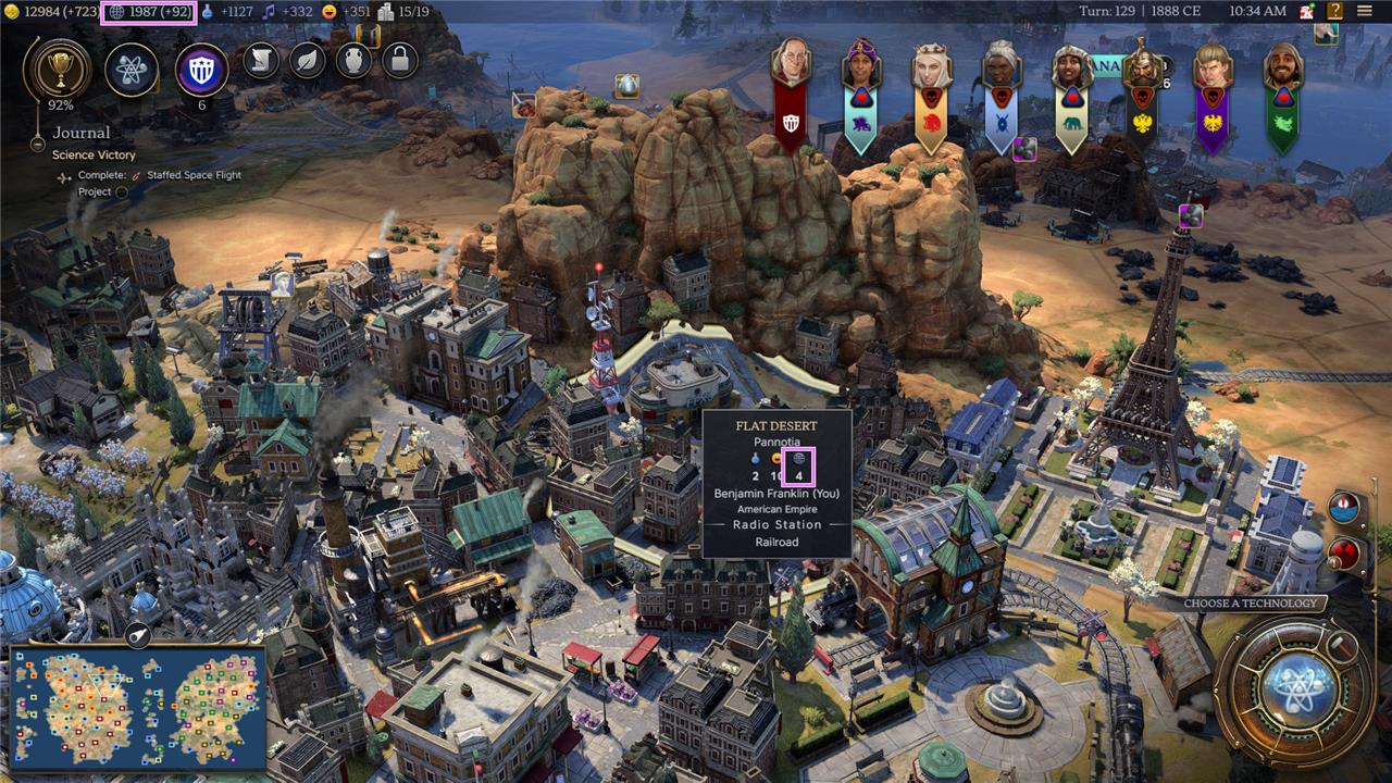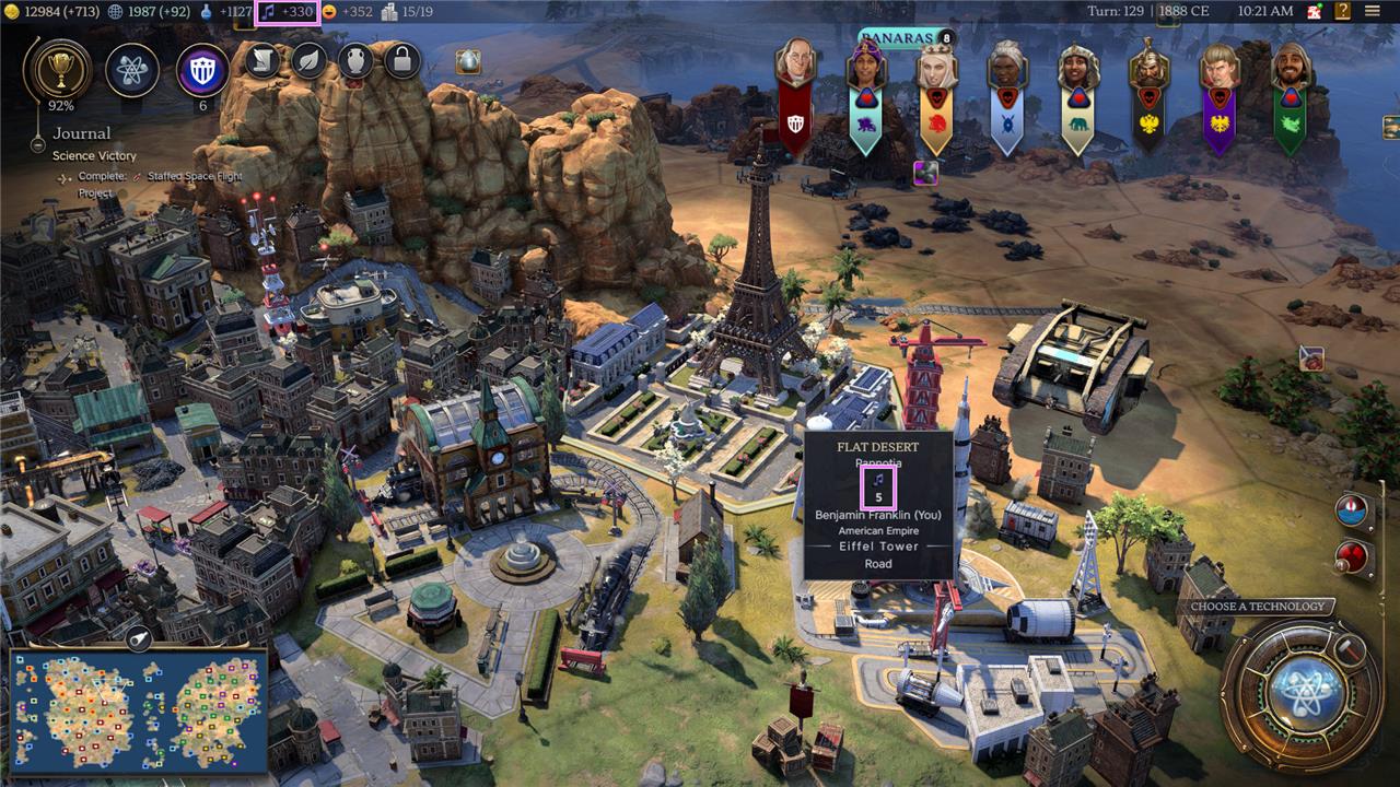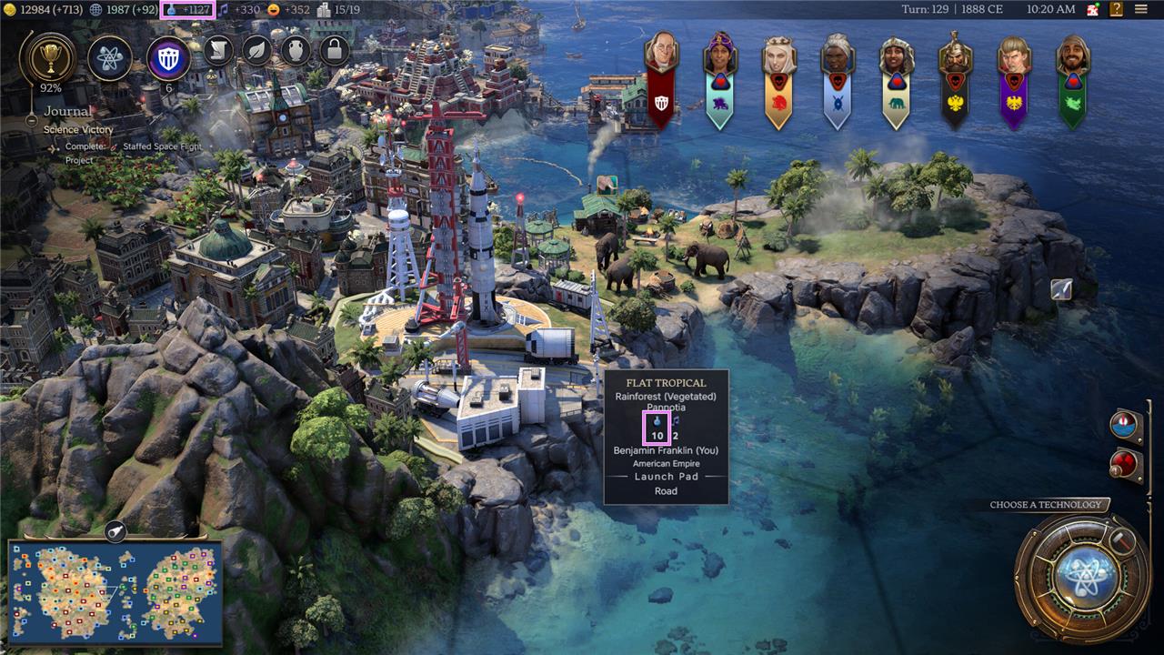 Your total Science yield per turn is displayed at the top of your screen on the resource bar, and includes all of the Science you’re currently earning from all of your tiles across your empire.