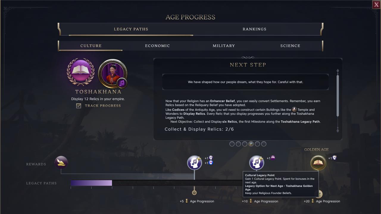 Once you have relics, you’ll need to display them in your towns via temples, your palace, or in a Wonder like the House of Wisdom. After you place 12 relics on display, you’ll finish the Culture Legacy Tree for this age and gain a bonus toward the next one.