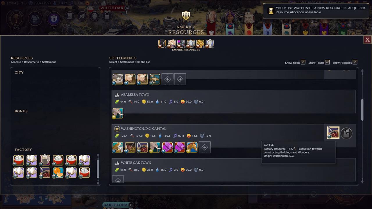 • Focus on trading with settlements that offer valuable City and Bonus Resources, as these can be allocated to your cities or towns to boost yields like Food, Happiness, and Production.