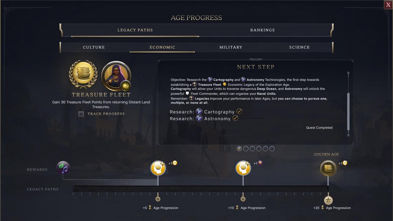 When you deposit a treasure fleet, you get one point for every treasure resource that’s in the settlement it came from. You need 30 treasure fleet points to complete this Legacy Path. Yikes.