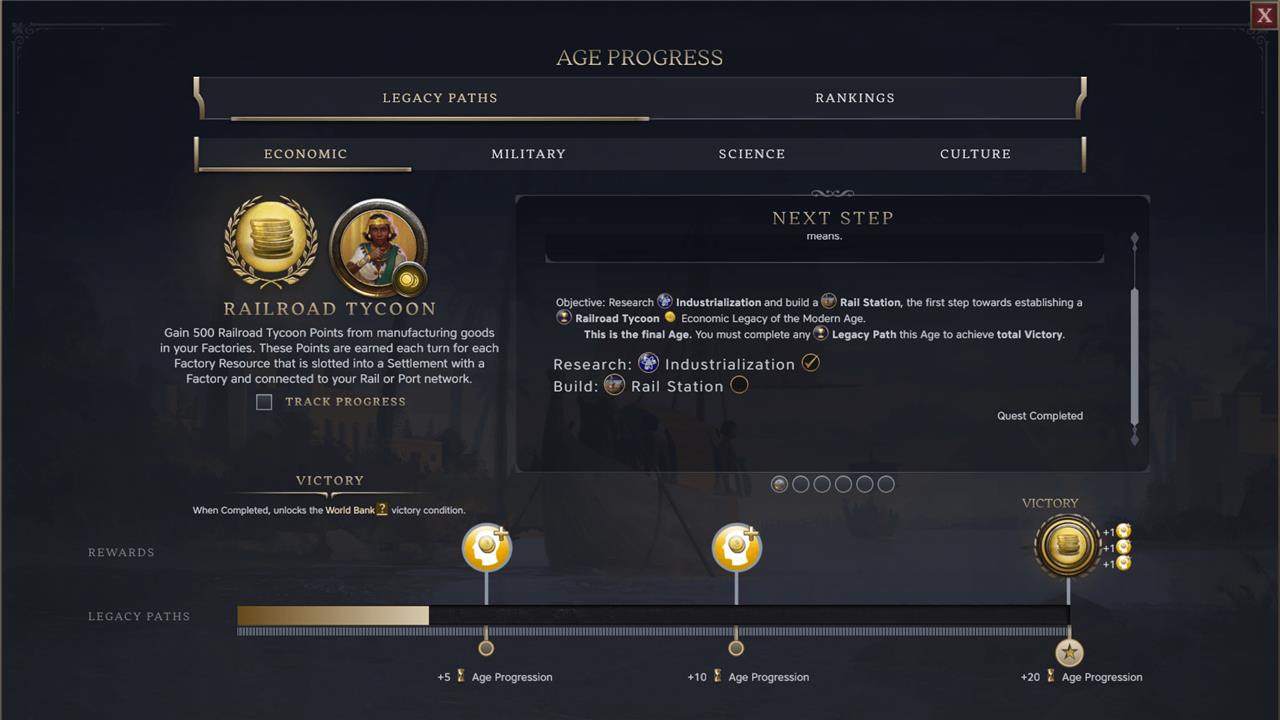 To achieve an Economic Victory in Civilization 7, focus on building a powerful trade empire by rapidly researching Industrialization and Mass Production to unlock Rail Stations and Factories. Connect your cities with rail networks and accumulate Factory Resources to generate Railroad Tycoon Points. Once you reach 500 Railroad Tycoon Points, a Great Banker unit will appear, which you must use to establish World Bank Offices in every capital city worldwide. This requires a strong economy with abundant Gold and Influence, as well as strategic expansion to acquire resources and trade routes. Balancing production, science, and diplomacy is crucial to efficiently build infrastructure and amass wealth, ultimately securing the Economic Victory.