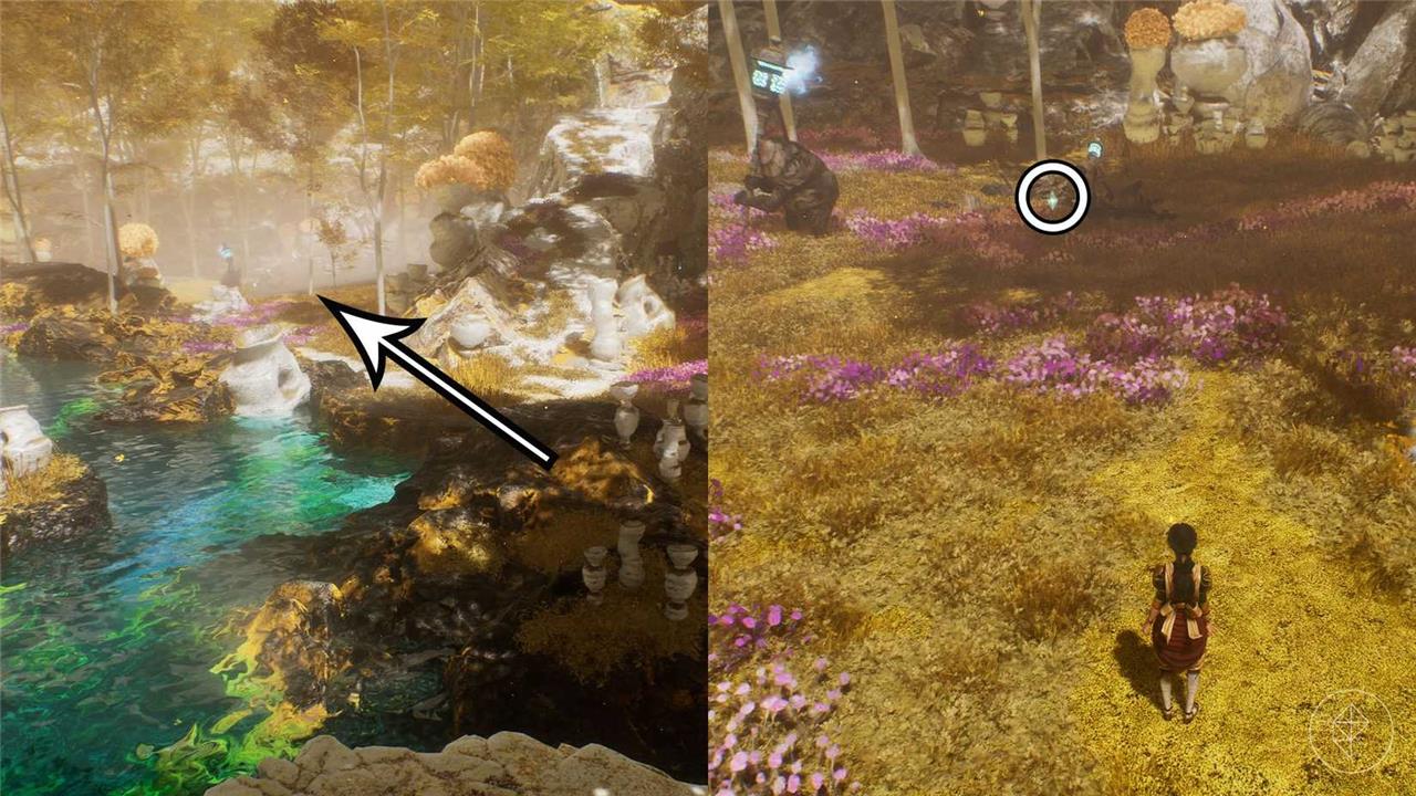 Talk to the Young Boy Spirit in front of the gate to the right of the Resinveil Grove Flag. He will send you on a quest to find the Lady of Sap. Next, go back south but take the path to your left to find a rope that leads downward. Follow the only available path to find the cave where the Lady is located. Talk to her, then return to the boy. He will then open the gate. Follow the recently opened path and, after using a rope to access the upper part of the area, you will find Journal 49.
