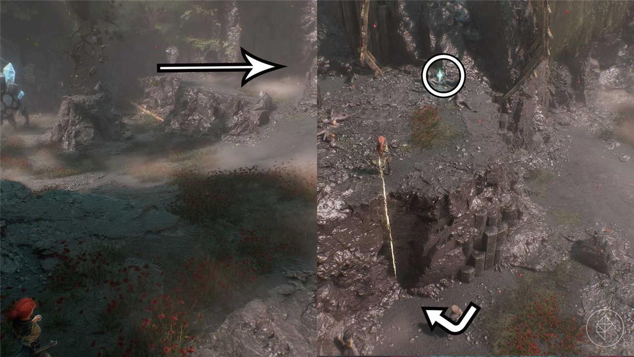 Going north from the Harvester’s Hollow Flag, you will come across a broken bridge covered in flowers. Climb it and grapple your way to the small cave where the Yellow Spire Wrecks Flag is located. Next, follow the path to the west of the flag to find a large red structure and Journal 59 nearby.