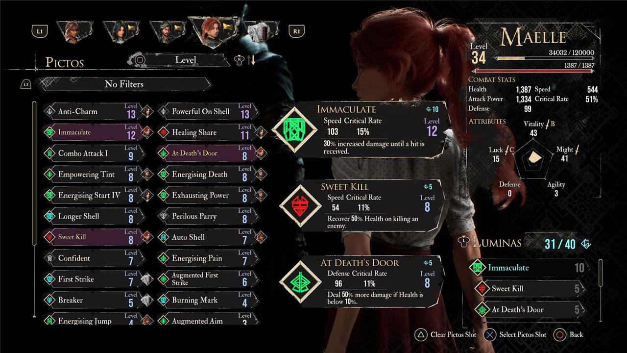 When it comes to these Pictos’ Luminas, they follow the same rationale that defines this build. Immaculate buffs your damage by 30% until you get hit by an attack, which is great for early Percées. Sweet Kill restores 50% Health when you kill an enemy. Since Maelle is your main damage dealer, she will likely land the final blow in most situations. Lastly, At Death’s Door increases your damage by 50% if Maelle’s Health is below 10%. This Pictos has a perfect synergy with Last Chance, allowing you to get the most out of a break window or when other buffs align.