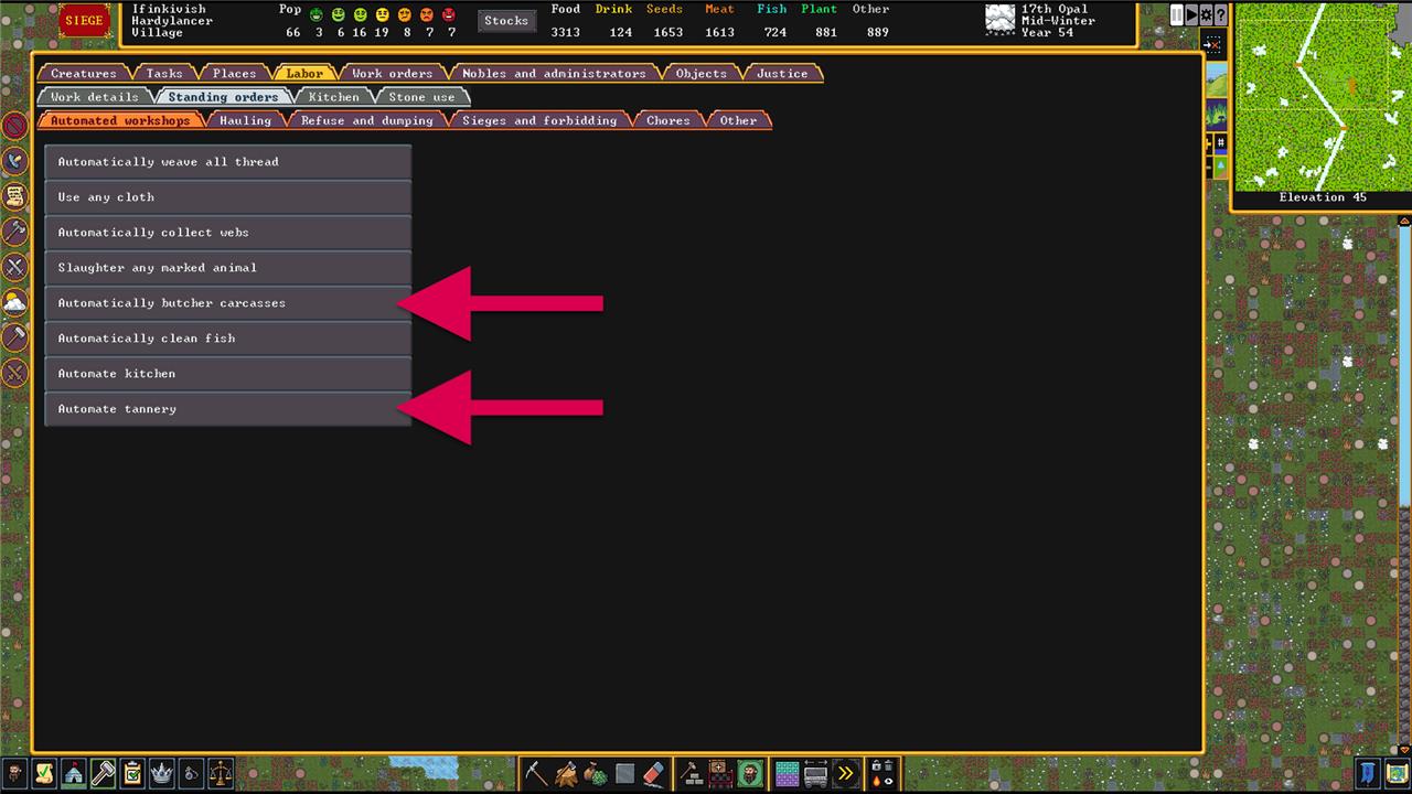 In the Labor (y) menu, click on the Standing Orders tab. You’ll see a list of jobs that just happen automatically. The two we’re talking about here are Automatically butcher carcasses and Automate tannery. They should be on by default, but this menu is where you’ll make sure. This means you’ll constantly turn carcasses in to hides and hides into leather whenever you have any.