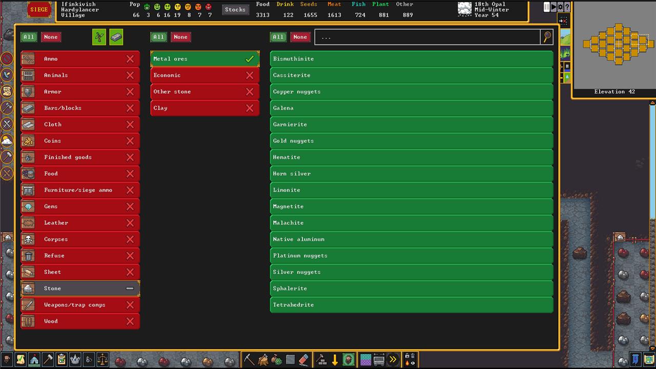 (A quick aside: metal ore is stored in Stone Stockpiles. If you want to create a dedicated stockpile just for ores, create a Stockpile (p) and set it to Stone. Before you close the menu, click on Custom. In the next menu, set Economic, Other Stone, and Clay to none. That will leave only Metal Ores active in your stockpile.)