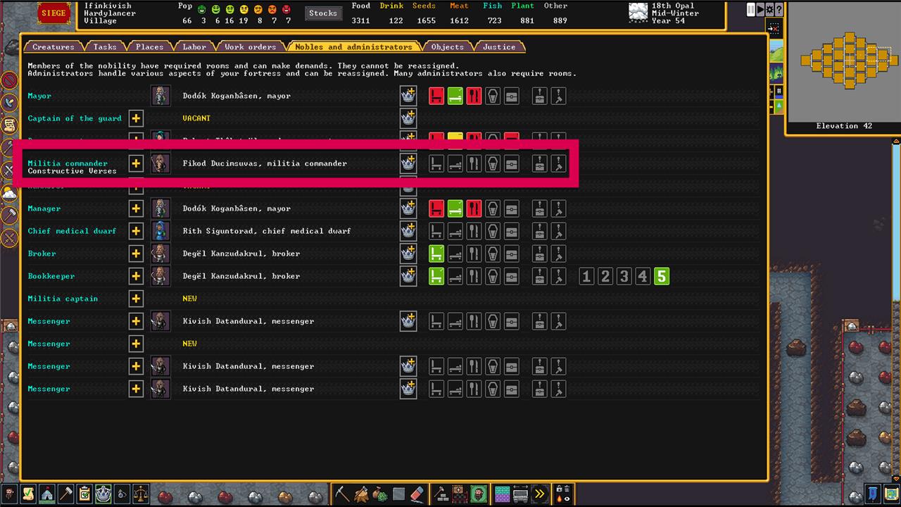 There are two military (or military-adjacent) roles in your Nobles and Administrators menu (n) – the Captain of the Guard and the Militia Commander. The Captain of the Guard (and his squad if and when you create one) are dedicated to internal conflicts and justice (and beatings) – they’re basically the police of your fortress. The Militia Commander and their squad are outward-facing and deal with monsters, invasions, and sieges.
