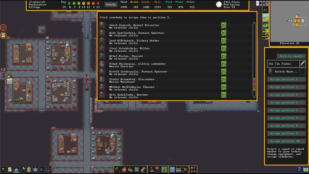 Click on a position, and you’ll see a list of all the dwarves in your fortress. Look for recruits with no job and some military skill first, but, really, anyone will do. Every dwarf you add inherits the uniform you selected.