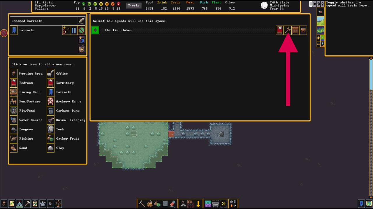 Once you draw your zone and accept it, click the banner and plus button to assign a squad to that barracks. In the next menu, you’ll be able to choose if this barracks is for sleeping, training, or storage (or all of the above).