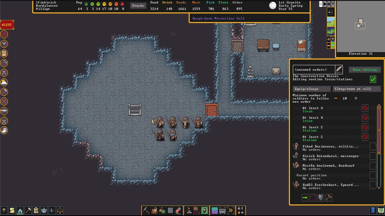 Assign each squad a clear set of duties through the military screen, such as patrolling, guarding key areas, or training during off-duty months. Use the monthly schedule to balance combat readiness and rest, adjusting active and inactive months to prevent burnout. Customize alerts to control which dwarves respond during an attack, ensuring a quick and organized defense. Regularly review orders and schedules to keep the military coordinated and responsive to threats around the fortress.