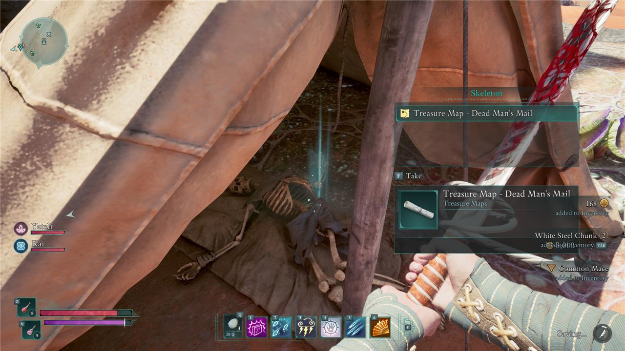 The Dead Man’s Mail treasure map in Avowed is hidden in the Great Sand Sea area of the Shatterscarp region. Specifically, you can find it in a small camp directly underneath the letter “S” in the word “Sea” on the in-game map. Inside one of the tents in this camp, there is a skeleton; looting this skeleton will yield the treasure map.