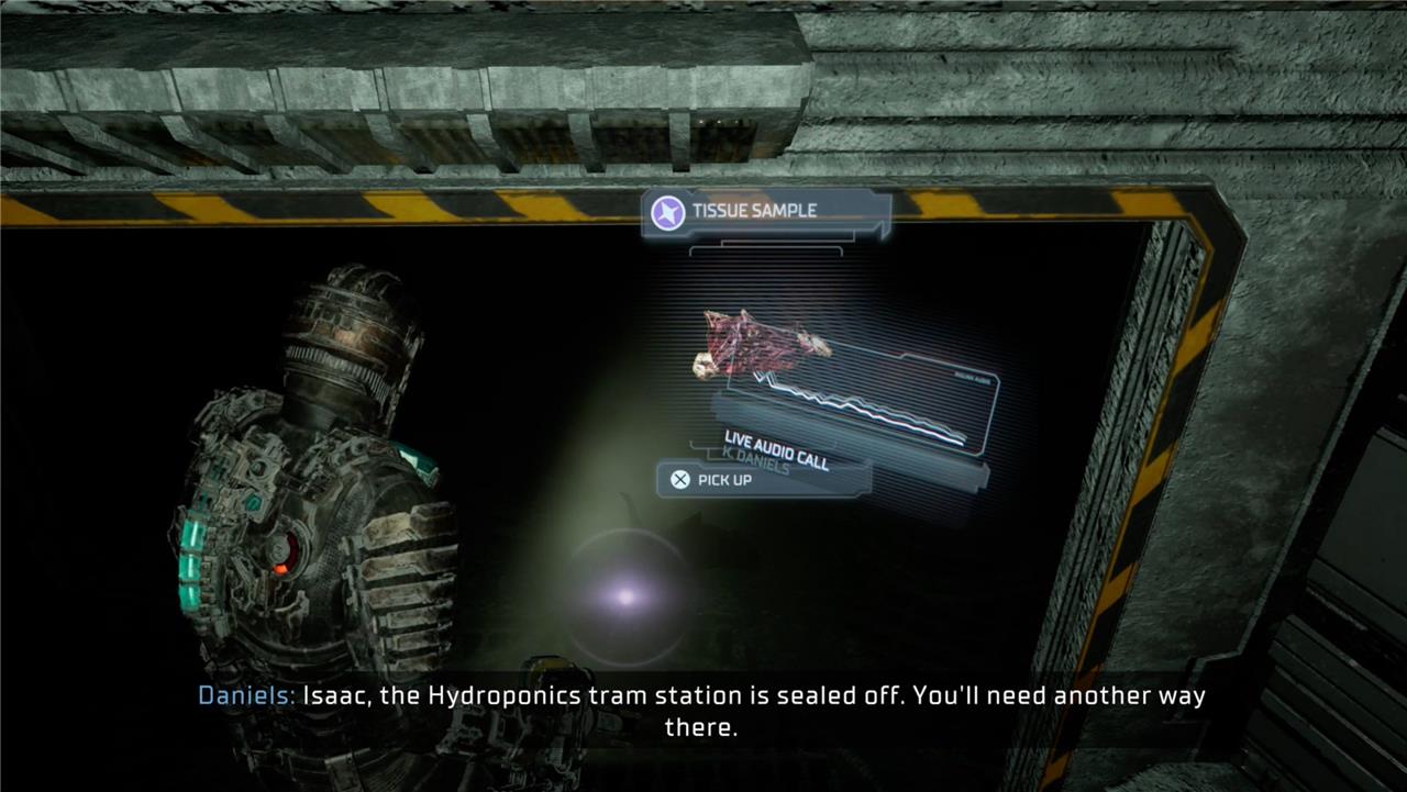 The Tissue Sample can be found inside the Dead Space remake’s Dead Space area, tucked behind a wall panel in the maintenance corridor near the medical wing. Look for a small, blue-glowing container mounted on the wall; interacting with it will grant the sample.