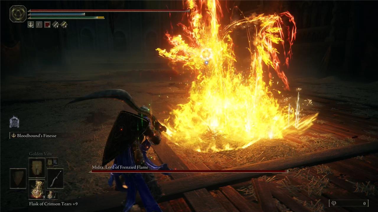 Phase 2 adds a stronger version of the Frenzied Burst spell to Midra’s arsenal of frenzied flame incantations. They shoot a barrage of fire projectiles in a straight line. Watch for when Midra’s head starts charging flames because it indicates they are about to use Frenzied Burst. Running sideways is an easy method to escape this attack. You can try to get closer to them as you run from the spell and land a couple of hits before they start using another move.
