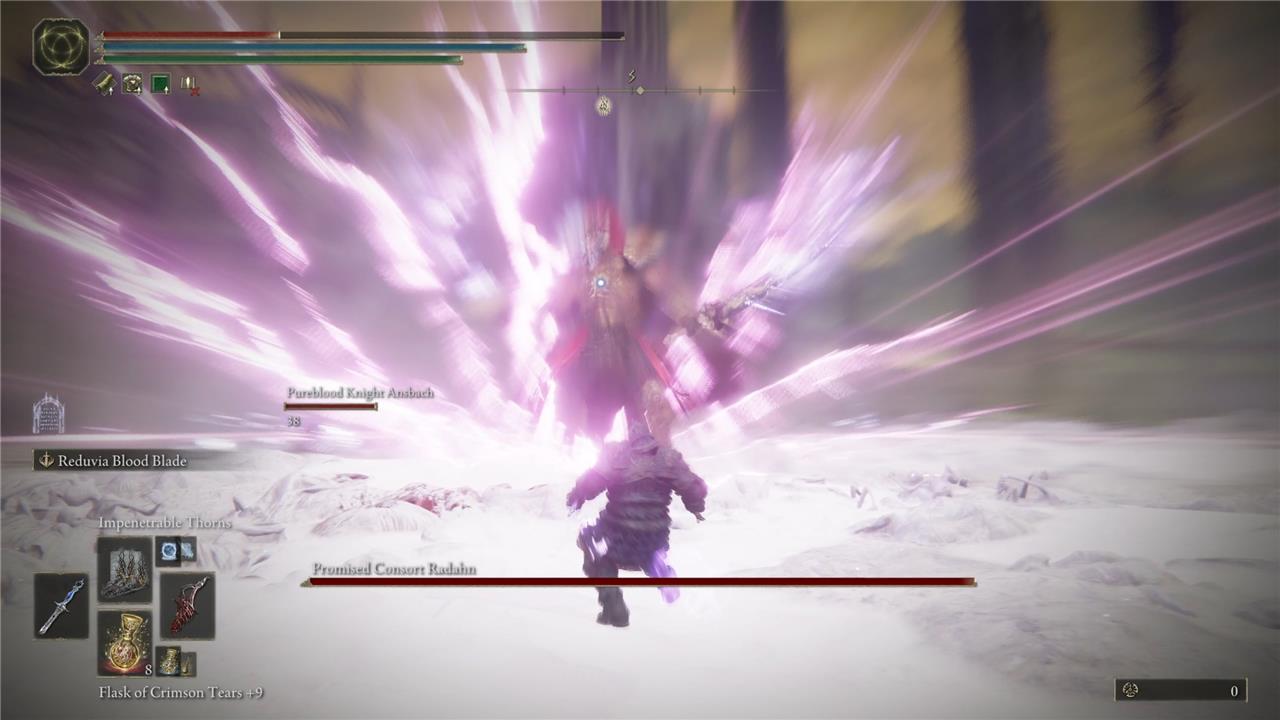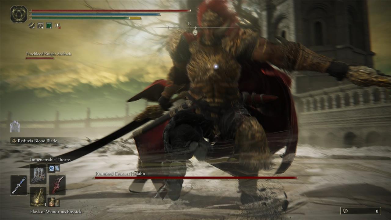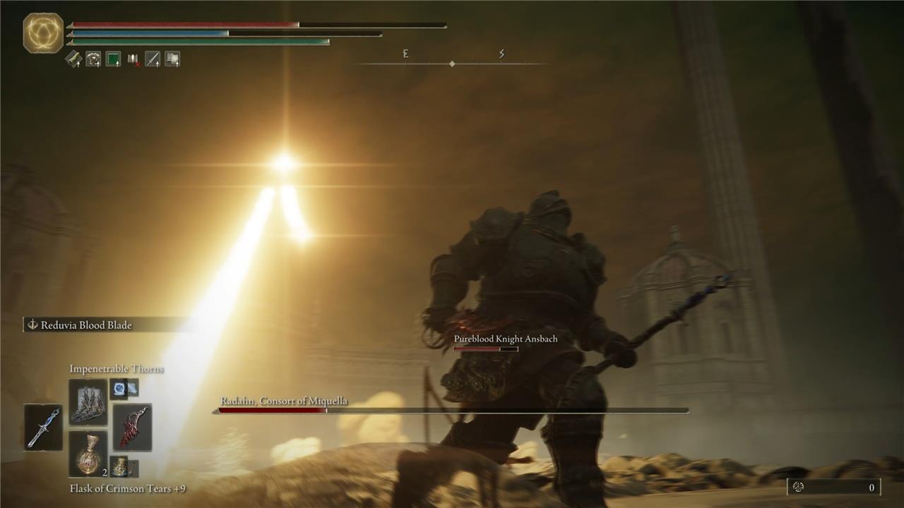 It builds blood loss more than any weapon that I tested, including those listed above, and the HP loss it results in for you is comparatively minimal, assuming you have a Vigor stat over 50. Keep casting Impenetrable Thorns when you can – when Radahn isn’t attacking you, in other words – and after every two hits or so, you’ll inflict Hemmorhage and reduce Radahn’s HP by roughly 2,000.