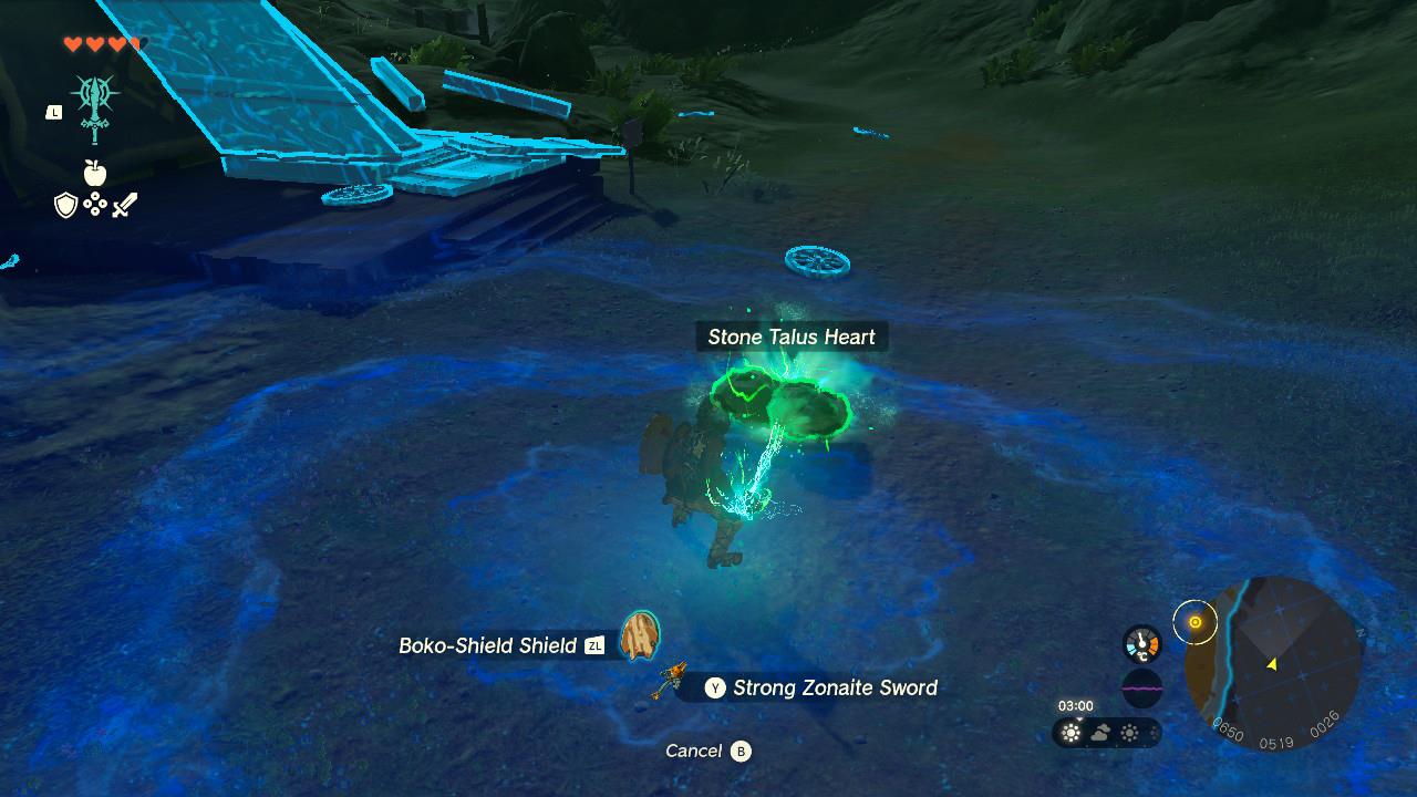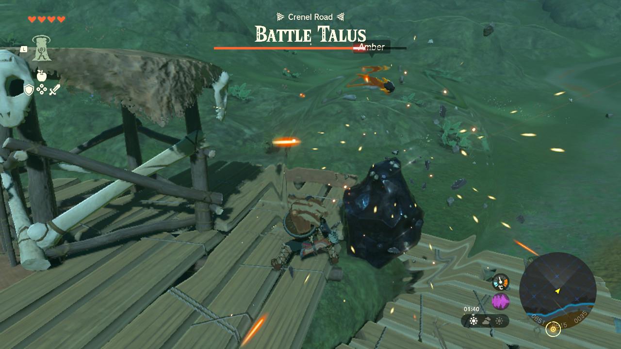 Target the ore deposit on the Battle Talus’s back after clearing Bokoblins from its platforms with arrows. Shoot the deposit or Rewind its thrown rocks to stun it, then use Ascend from underneath a platform to reach the top and attack with a blunt weapon like a rock hammer. Jump off before it shakes to avoid damage, and repeat until it bursts. Fuse its heart to a weapon for extra power afterward.โโ
