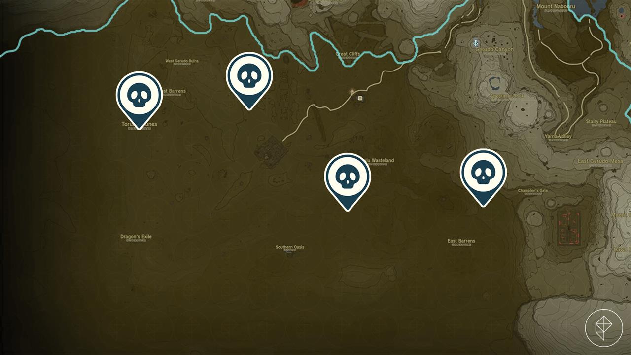 - Palu Westland South Molduga: Around the coordinates (-3323, -3325, 0016), southeast of Gerudo Town, and northeast of the Southern Oasis.