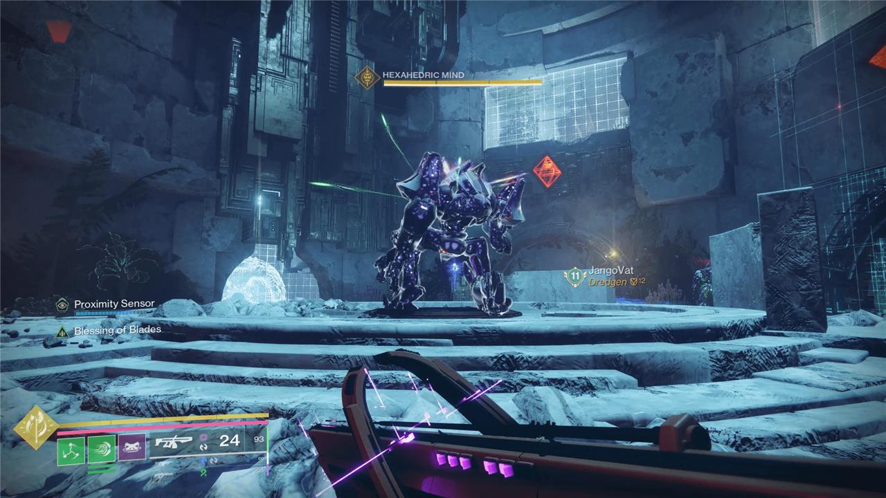 You’ll appear in the room that correlates to the little cube. Some shootable Vex nodes will appear here, but do not destroy them yet. There are three options in each room, and you need to wait until the little cube appears next to one of them. Once it does, destroy the corresponding node and then run out the front of the room and back into the arena. If you do this correctly, destroying the node will drop the shield on the Hexahedric Mind, allowing you to damage it.