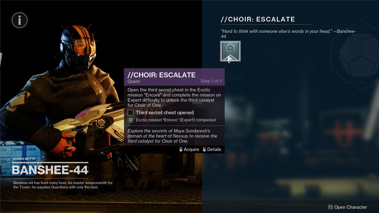 After you’ve claimed Choir of One for yourself and crafted it, return to Banshee-44 and he’ll give you the “//Choir: Escalate” Catalyst quest to go along with the above Catalyst quests. Like the others, Banshee will ask you to find a secret chest (which the quest calls “third,” but it’s actually the seventh chest on this list and the last one added to the mission) and complete the Encore mission on Expert.