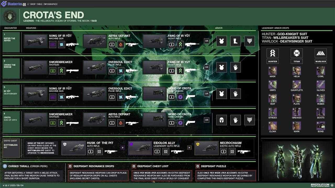 Crota’s End features a diverse loot table spread across its four encounters, offering players a mix of powerful weapons, unique armor pieces, and coveted cosmetics. Each encounter has its own specific drops: the first encounter (Enter the Abyss) can reward you with weapons like the Song of Ir Yût machine gun, Fang of Ir Yût scout rifle, and Abyss Defiant auto rifle, as well as chest, leg, and class armor pieces. The second encounter (Cross the Bridge) introduces the Swordbreaker shotgun and Oversoul Edict pulse rifle, alongside scout rifles and additional armor drops. The third encounter (Ir Yût, the Deathsinger) and the final battle with Crota, Son of Oryx, offer some of the most sought-after rewards, including the Word of Crota hand cannon and the chance for the Necrochasm exotic auto rifle. Players can also earn exclusive raid cosmetics such as emblems, an exotic ship, a sparrow, and shaders. Notably, Crota’s End becomes fully farmable when it is the featured weekly raid, allowing unlimited runs for loot, and players can use Spoils of Conquest at the post-raid chest to purchase previously unlocked items.