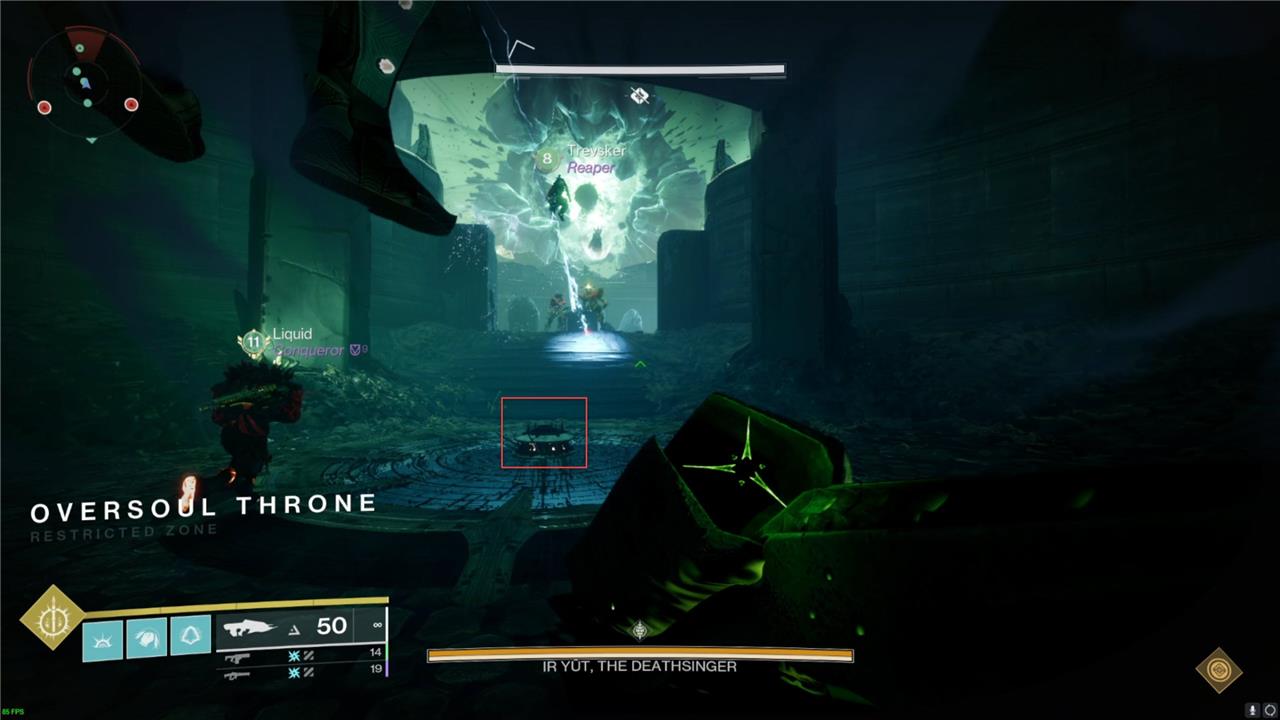 Once you’re in the room with the crystal, many more enemies will spawn and continue to spawn. The primary mechanic of this encounter is using the Enlightened buff to cross through the same type of green wall shields you passed through in the Shrieker Sprint to kill the wizards providing Ir Yut her shield. There wizards can spawn in seven places. We have provided a map of our team’s callout above.