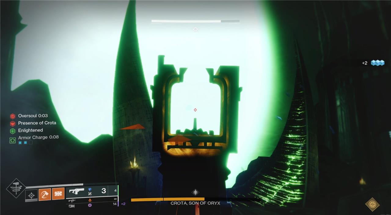 During the DPS phase, there will be a countdown timer on your screen called “The Oversoul.” If this reaches zero, your team will wipe. When you destroy the Oversoul, you also end the DPS phase, so you want to destroy it as close to the end of the timer as possible. Only a person with the Enlightened buff can damage the Oversoul, so at least four players need to get Enlightened per phase. (One note: the Oversoul does not have a lot of health. It can be taken down in one or two fusion rifle shots, so it is very easy to destroy accidentally.) Whoever is responsible for destroying it should make sure to face in a direction such that shots that miss Crota won’t hit the Oversoul.