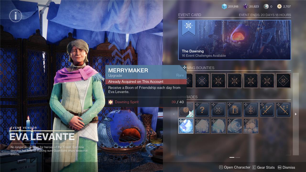 The Dawning 2022 has gotten the new holiday treatment that we also saw Bungie implemented with this year’s Festival of the Lost and Solstice. There are now event Challenges to earn, as well as a Title to claim and eventually gild. There are also, of course, upgrades for Eva that will help make your Dawning event that much more efficient and profitable.