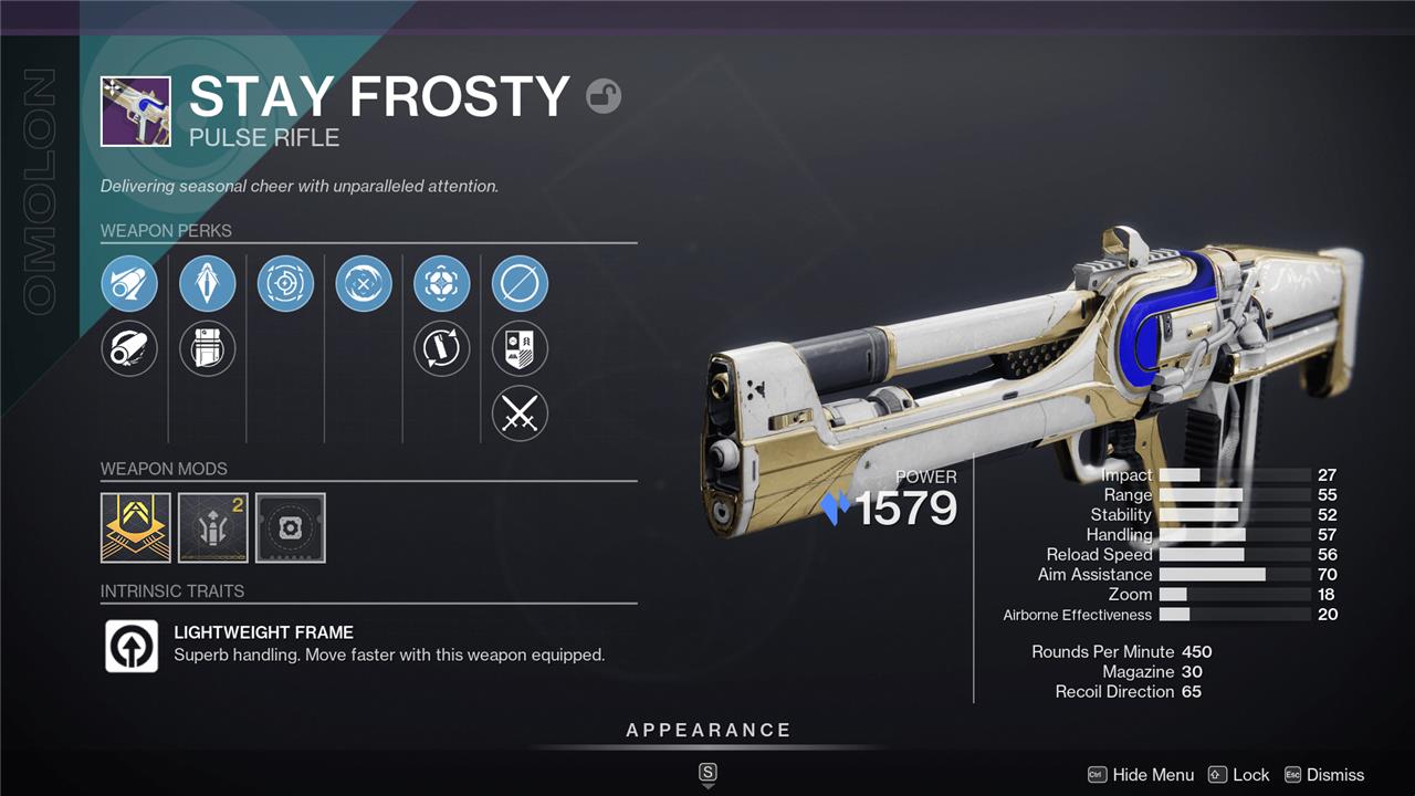 The Stay Frosty Stasis pulse rifle is the new hotness this year. It’s a Lightweight Frame Stasis pulse rifle that’s also part of the Omolon family. You’ll get the first one of these by completing Eva’s Dawn of Dawning Challenge, which acts as the tutorial for this year’s holiday event.