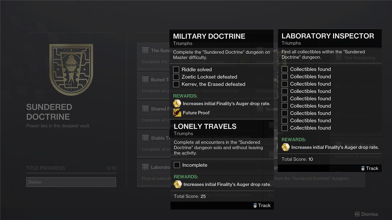 2. There are a handful of Triumphs in the Sundered Doctrine seal that, when completed, will increase your drop rate for Finality’s Auger. Those Triumphs are: