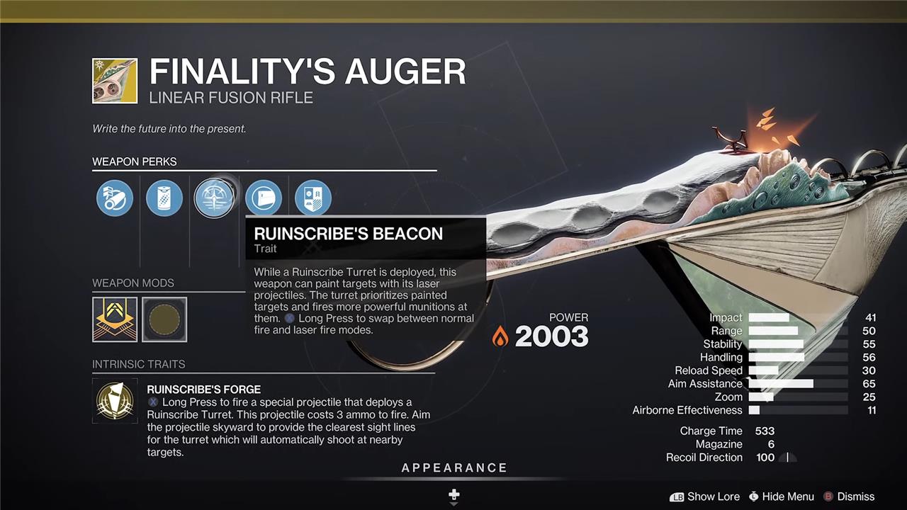 Finality’s Auger is a unique Exotic Linear Fusion Rifle in Destiny 2 that stands out due to its turret deployment mechanic and target-marking system. Its special perk, Ruinscribe’s Forge, allows players to fire a projectile that deploys a turret which automatically attacks nearby enemies, providing excellent crowd control. Additionally, Ruinscribe’s Beacon lets the weapon paint targets with laser projectiles, causing the turret to prioritize and deal more damage to those targets. While it may not offer the highest raw DPS compared to other Linear Fusion Rifles, its utility, sustained damage, and synergy with Solar builds make it a versatile and fun choice for PvE content. However, turret deployment consumes three rounds of ammo, limiting continuous firepower, and it requires good positioning to maximize effectiveness. Overall, Finality’s Auger is a strong and innovative weapon that offers a fresh playstyle, especially valuable in the Sundered Doctrine dungeon and Episode: Heresy content.