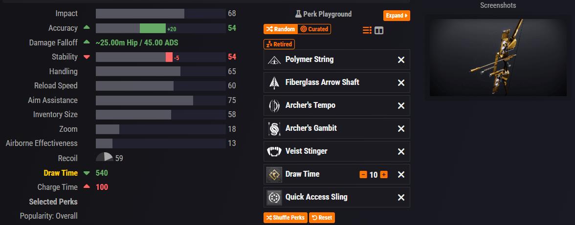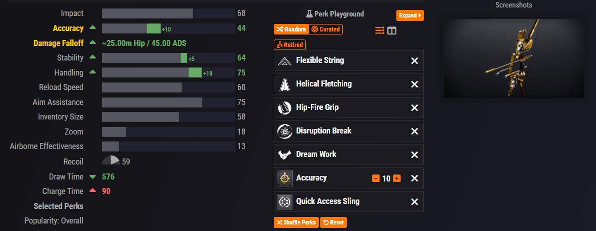In PvP, bows are swap weapons. The idea is to deal damage with Fortunate Star, quickly swap to another weapon like a Kinetic hand cannon, and finish your target off. Because of this, we’ll want high handling, great target acquisition, and a faster initial draw time on Fortunate Star.