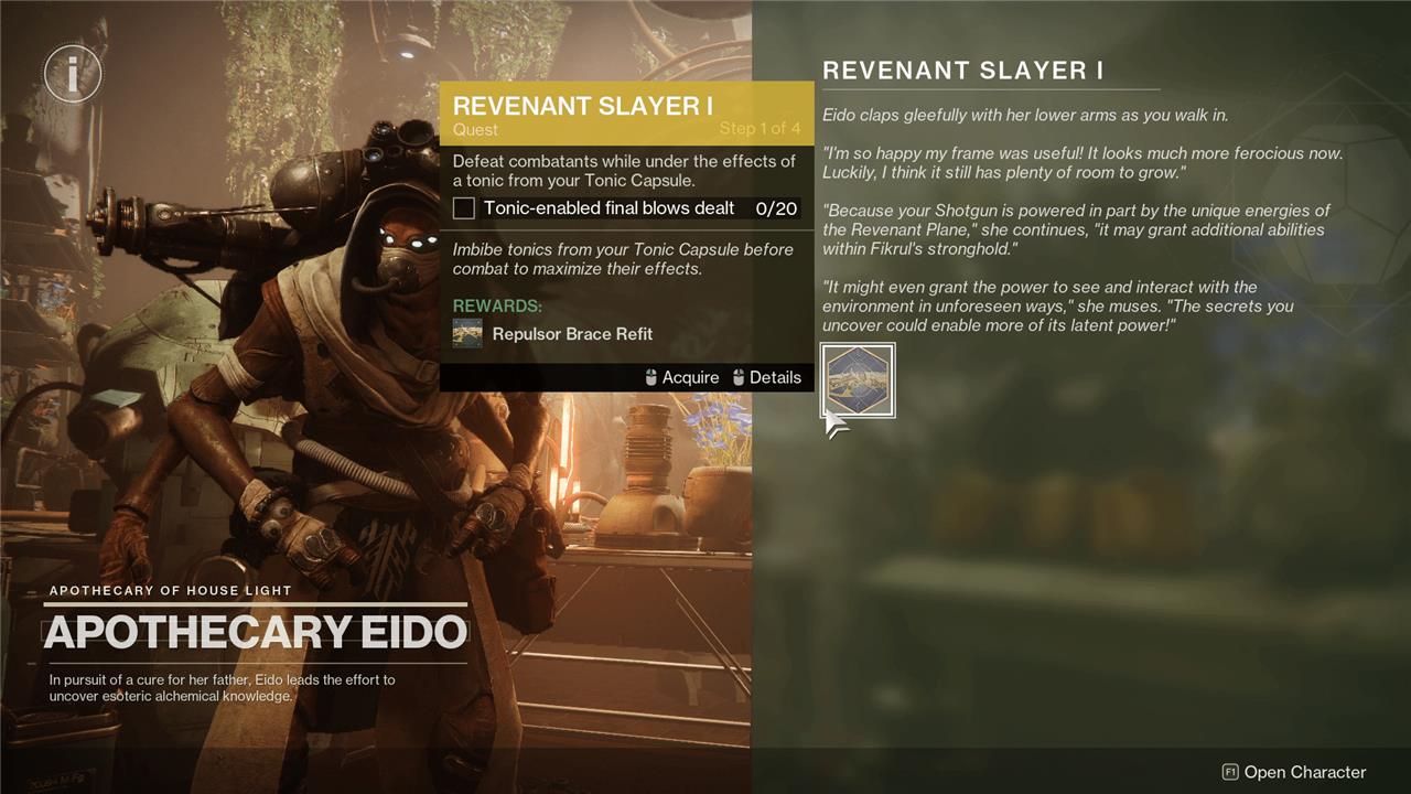 After you complete the “Kell’s Fall” Exotic quest for the first time, you’ll be prompted to return to Eido at her lab. She’ll talk to you a bit and give you “Revenant Slayer 1,” “Revenant Slayer 2,” “Revenant Slayer 3,” and “Revenant Slayer 4” all at the same time.