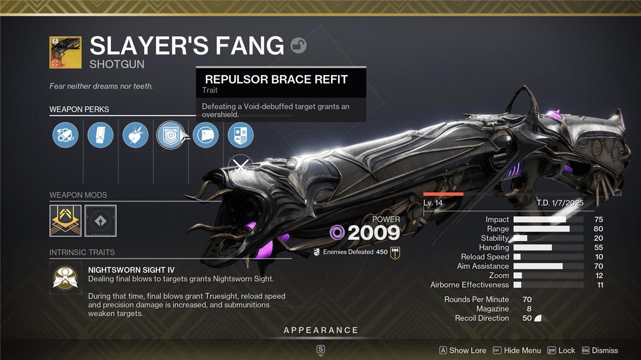 We’d recommend you take Repulsor Brace, though. Because Slayer’s Fang is always Weakening targets, Repulsor Brace will constantly be active, meaning you’ll get a Void Overshield multiple times per-magazine. This will keep you healthy while you’re up in shotgun range, and can even play nicely into some other subclass bonuses – especially for all the Void Titans out there.