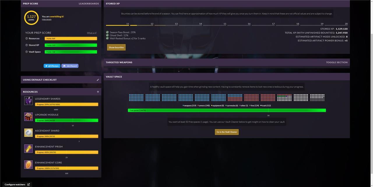 One of the best ways to prepare for a new season or expansion is to start saving up on materials and bounties. There are a few community-made tools that can help you prepare, like the amazing Destiny Recipes. Log in with your Destiny 2 account, and this tool will help show you the materials, bounties, and vault space you have, thus giving you a target to aim for. Below we’ll break down the major categories of this checklist to help give you an idea of what to stockpile before Lightfall.