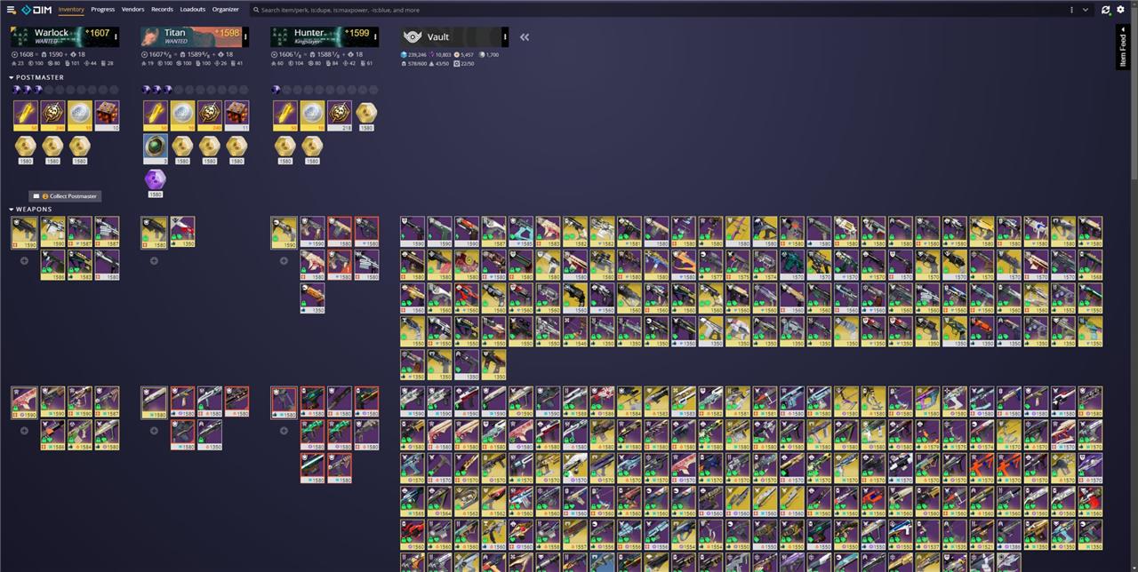 Our biggest tip when it comes to keeping your vault clean is to use a tool like Destiny Item Manager (DIM), which allows you to organize your inventory outside of the game. DIM is packed full of amazing features that not only help keep your vault clean but streamline playing the game as well. DIM’s primary feature is to help move items between your characters and the vault, but it can also do more.