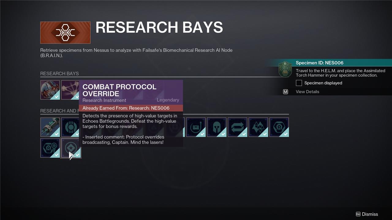 To complete the “Specimen ID: NES006” quest in Destiny 2, first, ensure you have completed the Rising Chorus Act 2 quest to unlock the ability to find the specimen. Then, head to the Battlegrounds activities, particularly the Battleground: Core, where the NES006 specimen, known as the Assimilated Torch Hammer, can be found near the end of the mission just before the rally banner, tucked by a wall near a Ved Radiolaria geyser. Use the Proximity Sensor alert from Failsafe to locate it. After collecting the specimen, you must complete several objectives: defeat enemies using Sidearms or Auto Rifles, kill enemies with Arc or Solar damage, and generate Orbs of Power. These tasks are best completed in high enemy-density activities like Lost Sectors or Vanguard Ops. Once done, return to Failsafe at the H.E.L.M., place the specimen in the display tank, and claim your rewards, which include the Data Format Cipher and Combat Protocol Override.