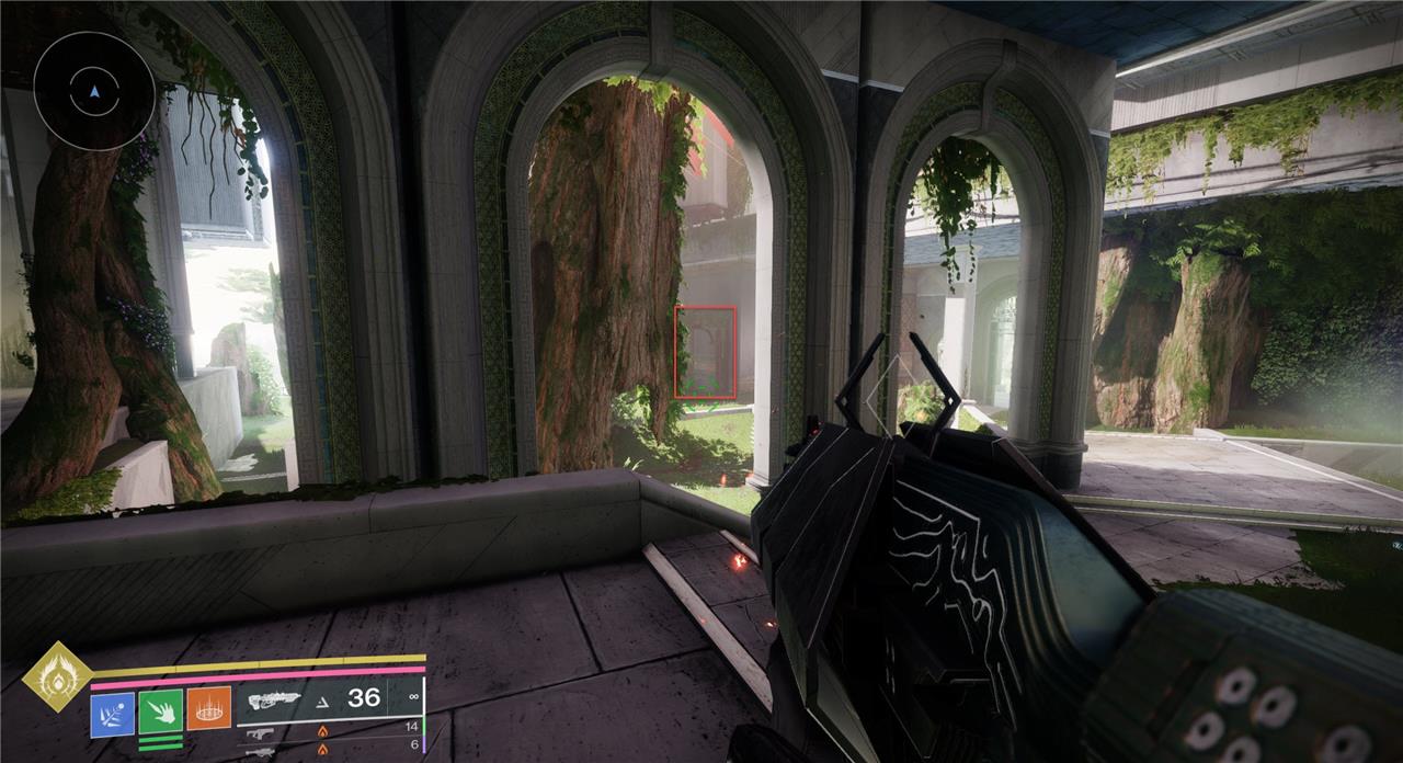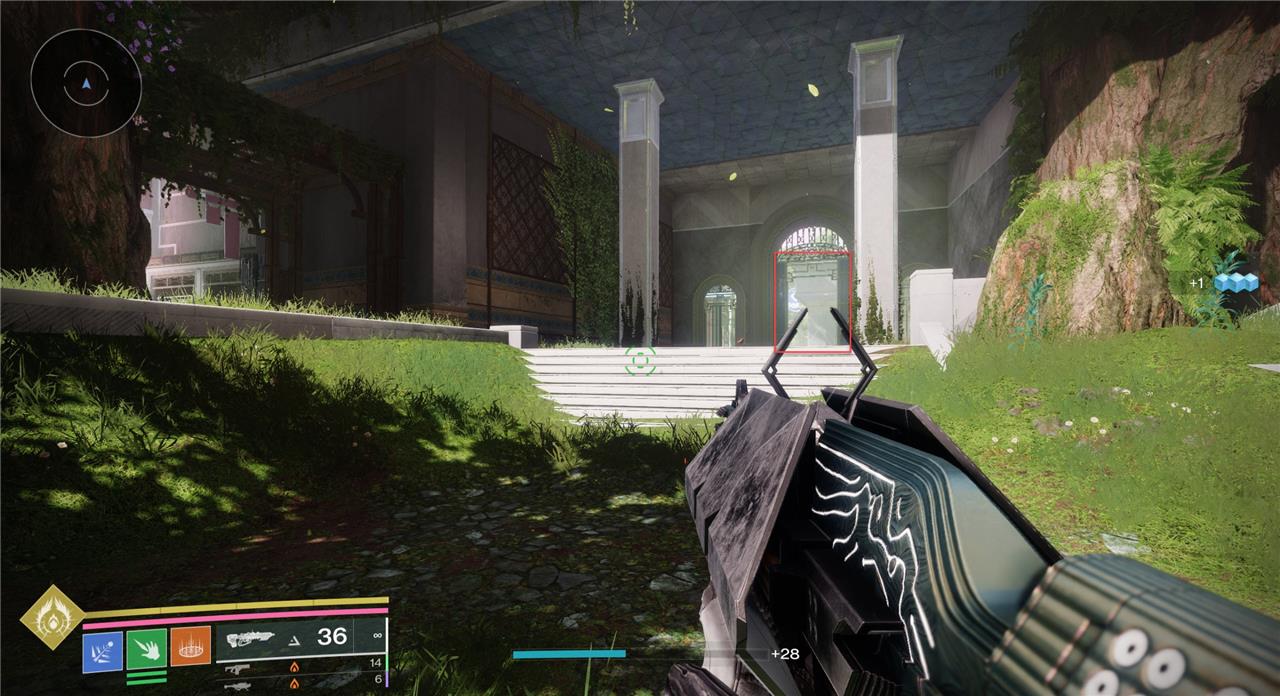 For the third ghost location in the Overgrown Prismatic Key quest, head to the area with the railing near the previous ghost. Use the platforms extending from the ledge of the railing to leap across into the adjoining room. Continue forward until you find yourself back outside-look above the doorway here, and you’ll spot the third ghost perched above it. Interact with this ghost to collect it before moving on to the final location.