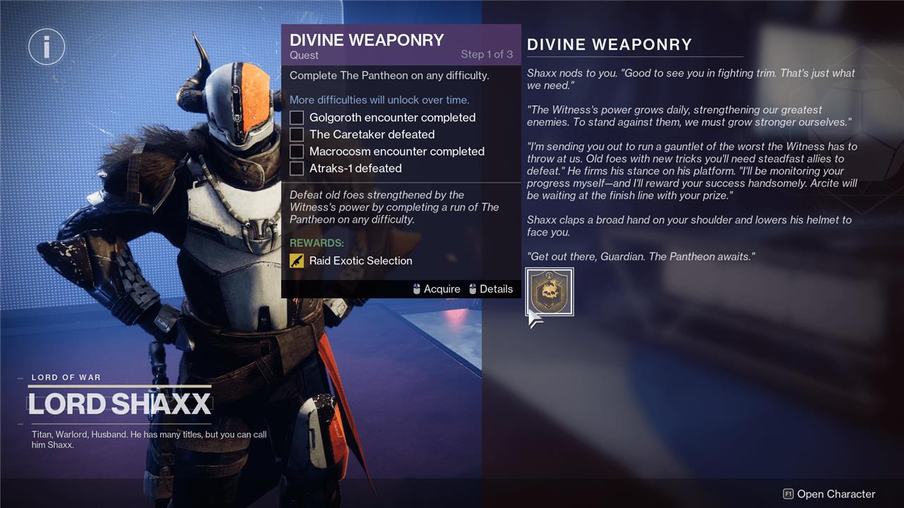 But the best part of The Pantheon activity is the “Divine Weaponry” quest. If you manage to complete all the bosses in Atraks Sovereign Pantheon, you can choose from a collection of raid Exotics you might be missing. You can guarantee yourself one raid Exotic as part of completing this quest – weapons that have always been random in the past, and can take dozens of clears to earn.
