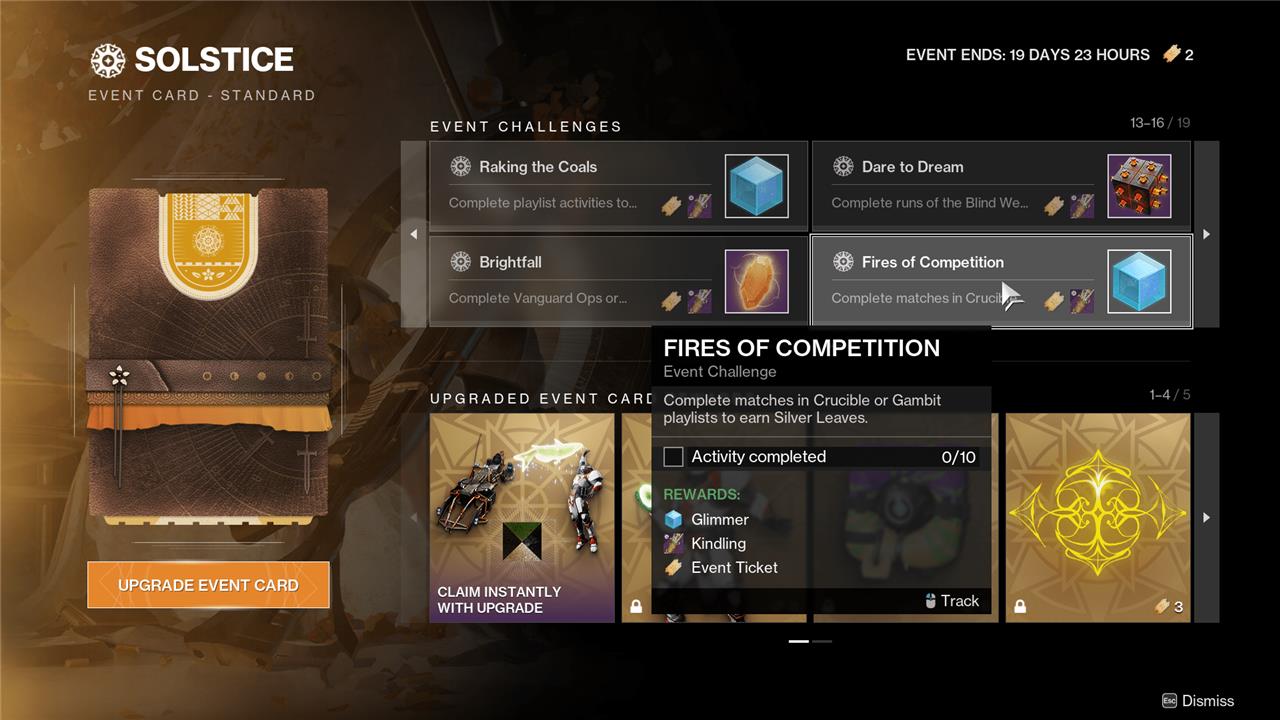 - Fire of Competition( 1 Kindling) – Complete (10) matches in Crucible or Gambit playlists to earn Silver Leaves