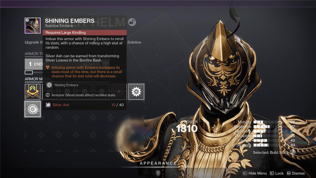 Solstice 2023 is all about upgrading your Sunlit armor with Kindling and Silver Ash. Silver Ash is easy enough to come by, and we’ll go over it and Silver Laves in more detail later on in this guide. Kindling, on the other hand, is a much more finite resource, and the most important one for fully upgrading your armor so it can A) have better stats and B) glow!