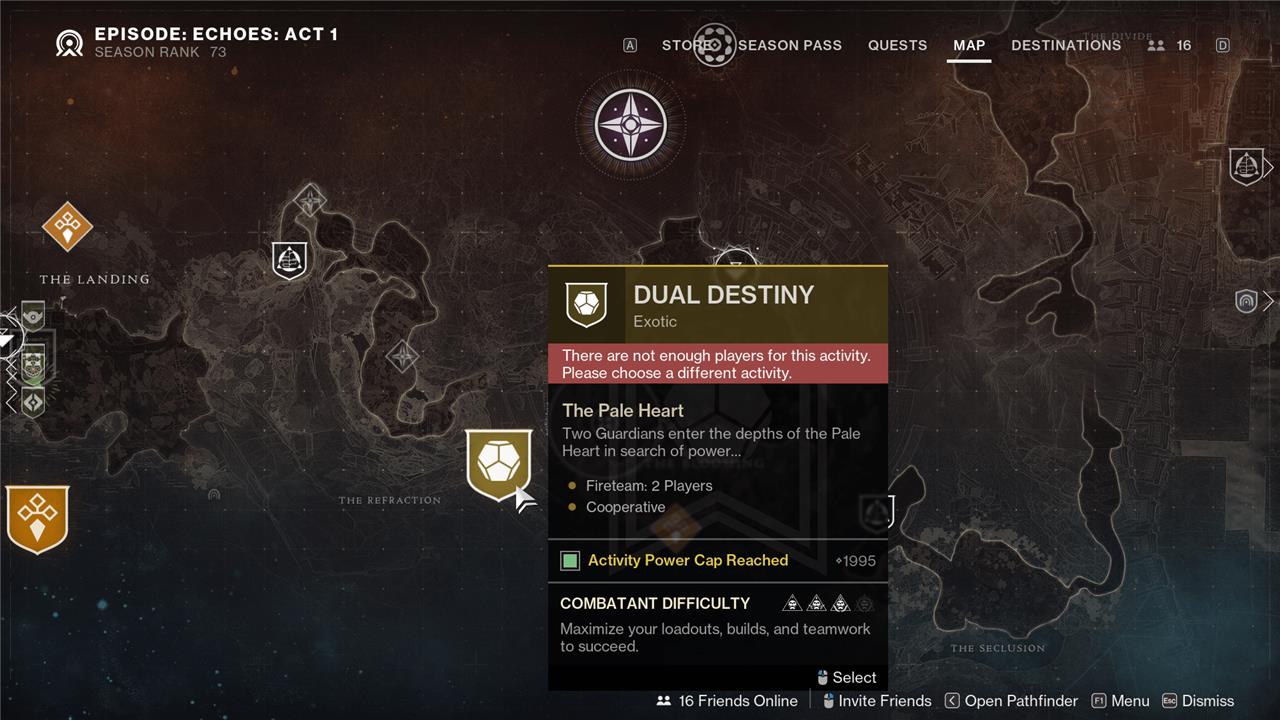 To unlock the ’Dual Destiny’ mission in Destiny 2: The Final Shape, you must first complete the Overthrow public event activities in all three zones of the Pale Heart: The Landing, The Blooming, and The Impasse. These Overthrow events escalate through multiple tiers, culminating in a boss fight at Tier 3, which you need to defeat in each zone. After clearing each Overthrow and defeating the associated boss, a special Lucent Hive enemy (often referred to as the Secret-Keeper of the Witch Queen) will spawn-defeat this boss within the five-minute window before moving to the next zone. Once all three zones are complete, head to The Refraction area (between The Blooming and The Landing), where you’ll receive the Savathun’s Envoy buff in a crystallized room. Here, you must collect and return two orbs (one Light, one Dark) to unlock the mission. Only then will the ’Dual Destiny’ secret mission become available, allowing you and a partner to attempt it for a chance at Exotic class items. Note that this mission requires a fireteam of two and does not offer matchmaking.
