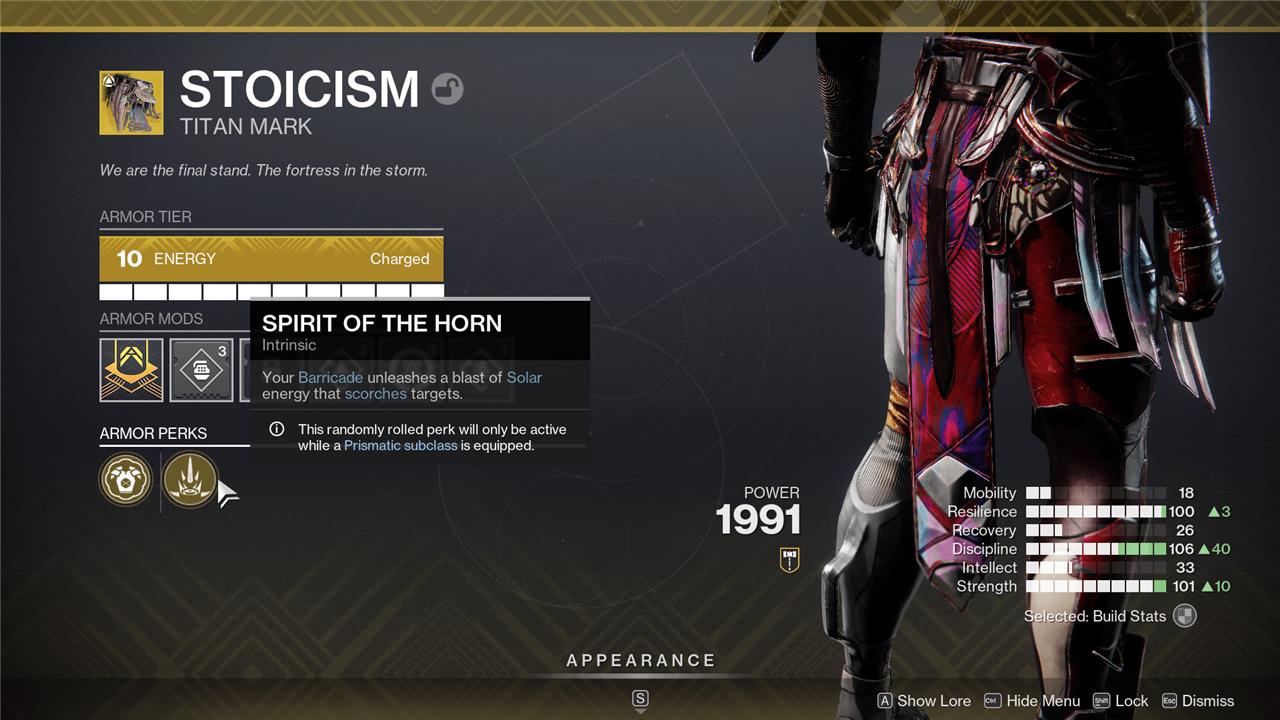 Spirit of the Eternal Warrior: Gain a damage bonus for weapons matching your Super’s element when your Super ends. Spirit of the Horn: Your Barricade unleashes a blast of Solar energy that scorches targets.
