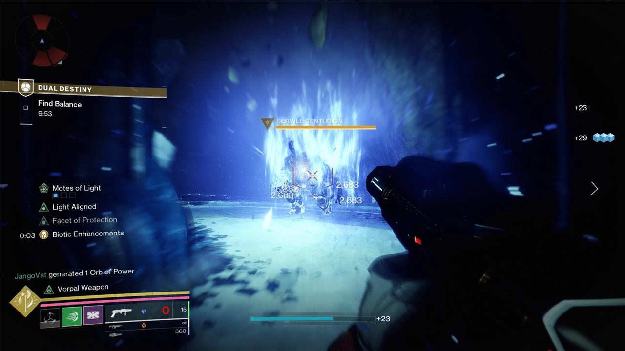 When you’re both in position, enemies will start to spawn. After a wave or so, you’ll each encounter an enemy that matches your alignment and glows with either Light or Dark. For the Dark player, it’ll be a Taken Knight, while the Light players will get a Taken Centurion. You’re only able to damage the enemy that matches your alignment, so there’s no use running up to help your friend.