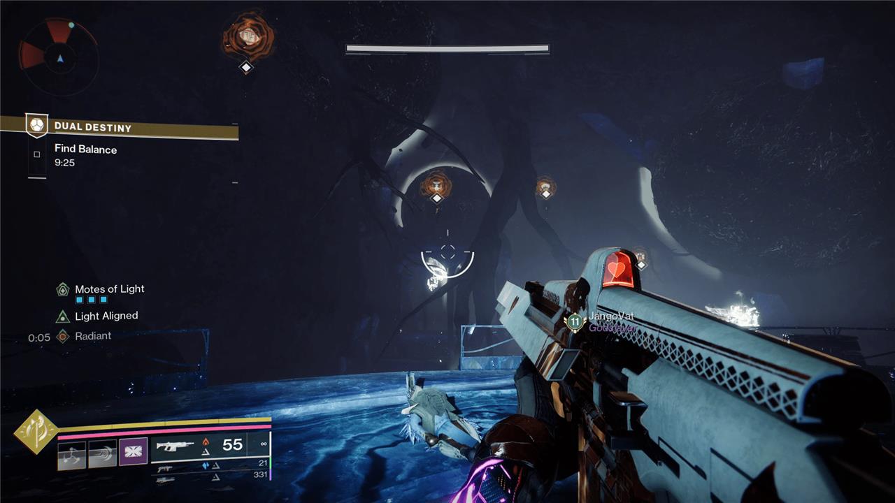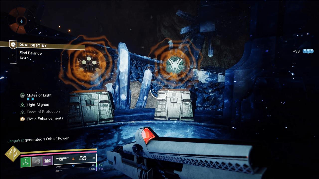 Don’t do anything just yet. First, max out your mote counter, which you can see on the left side of your screen. To do this, keep killing enemies until your aligned boss spawns again. Once it shows up, kill it, and grab its mote. As long as you’re both full on motes, it’s time to get out of here. As the Light player, read off the symbols you have on the chests, in order from left to right. As the Dark player, listen for the callouts and shoot the crystals that have the matching symbols your ally just called. You must do this in order from left to right or you’ll fail.