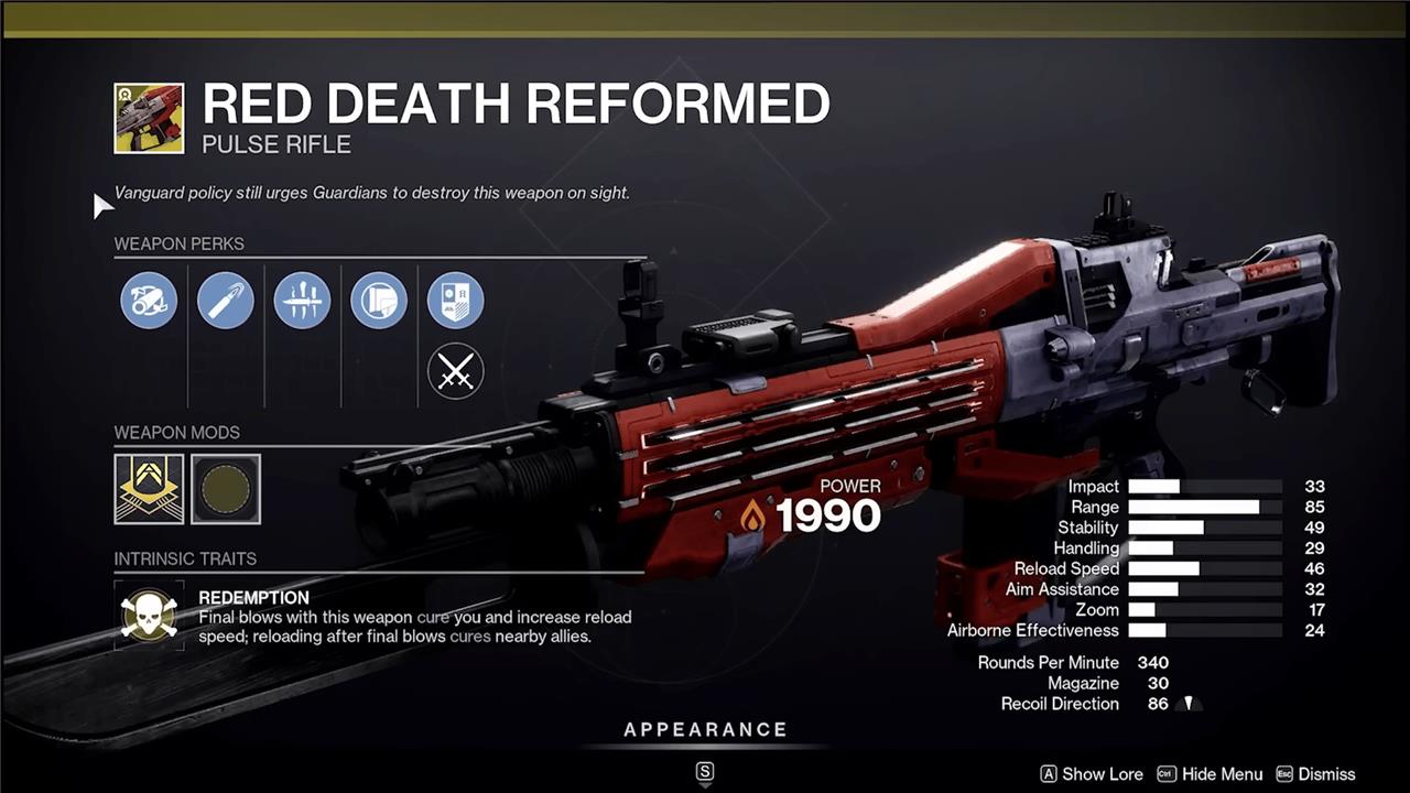 Red Death Reformed’s Intrinsic Exotic perk is Redemption, which causes final blows with the pulse rifle to Cure you and increase your reload speed. Reloading Red Death Reformed after you get a kill causes it to Cure nearby allies as well. The Inverse Relationship Exotic perk causes you to flinch less as well as gain increased handling and movement speed when you deal damage with Red Death Reformed. The Exotic pulse also deals more damage when your health gets low.