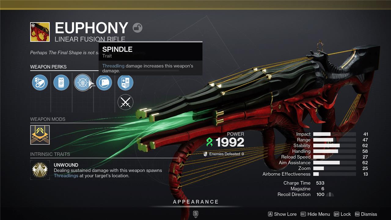 Euphony’s Intrinsic Exotic perk is Unwound, which causes the gun to spawn Strand Threadlings when dealing sustained damage. Spindle is the secondary perk, which causes Threadlings damage to give Euphony a stacking damage buff.