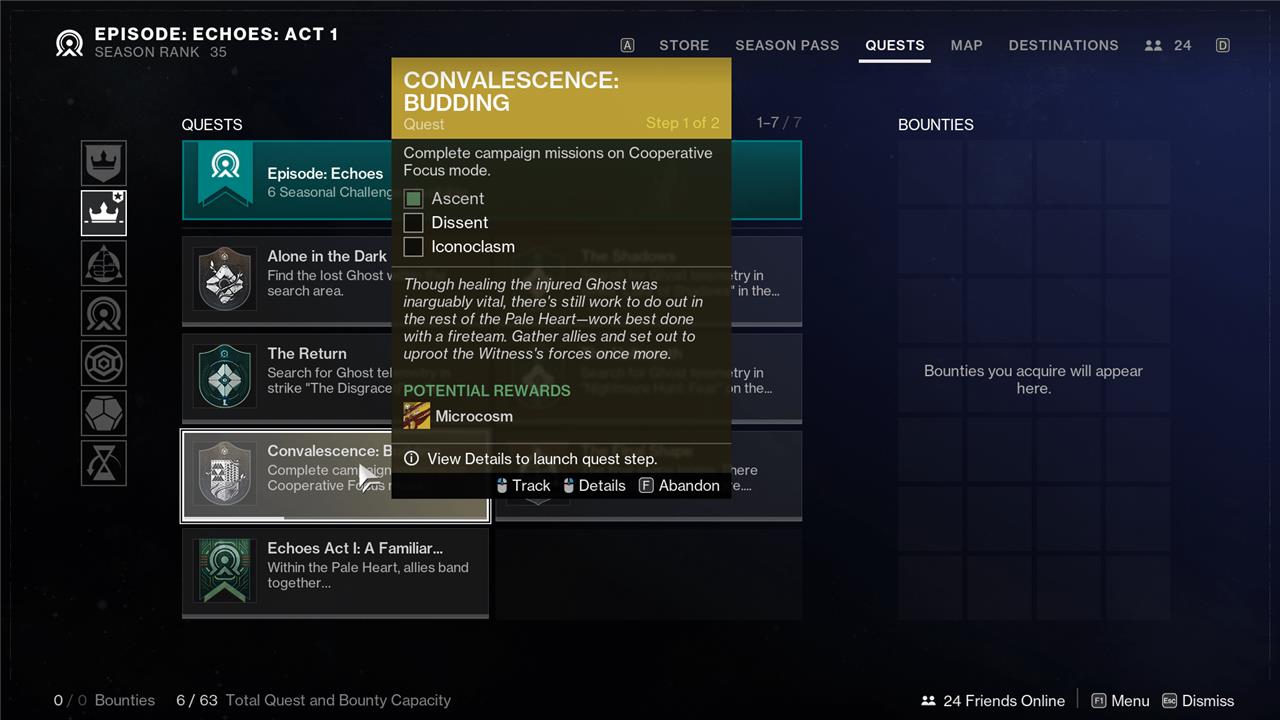 You’ll pick up the first quest in the Convalescence chain – “Rootbound” – while working your way through “Destined Heroes,” which you’ll start immediately after the campaign. Starting with “Rootbound,” you’ll then need to complete each of the Convalescence quests in order to reach “Budding” and Microcosm.