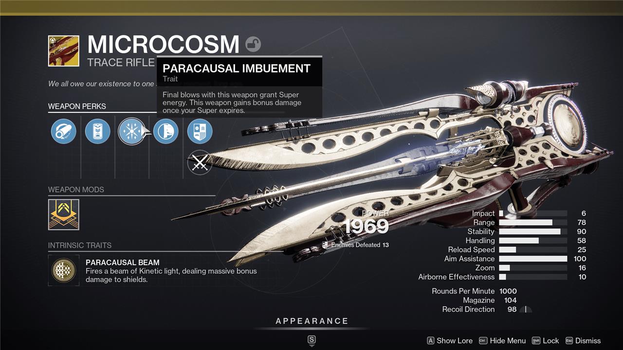 Microcosm has two Exotic perks. The first is Paracausal Beam, which causes the gun to fire Kinetic light, dealing massive bonus damage to shields. The second is Paracausal Imbuement, which causes kills with Microcosm to grant you Super energy. Additionally, Microcosm does additional damage for a short time after your Super expires.