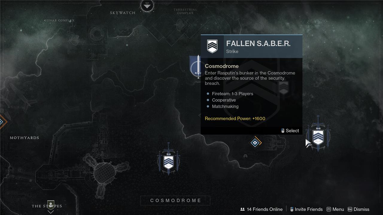 With the Clovis mask on, open the map for the Cosmodrome, select the Fallen S.A.B.E.R. Strike from the map, and complete it.